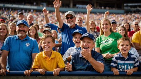 A heartwarming family moment at a sports event where grandparents and grandchildren are cheering enthusiastically, showing family togetherness and the excitement of the game.