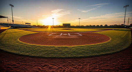 The warm glow of the setting sun casts a golden light over the baseball diamond, highlighting the neatly trimmed grass and the well-defined base lines of the field.
