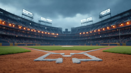 Vivid image of a baseball stadium with a dramatic sky, showcasing a well-maintained field and illuminated stands filled with fans, perfect for sports-themed content.