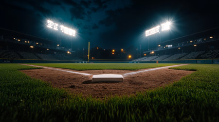 A baseball field is brightly lit under the night sky, showing the diamond and grass. The stadium is filled with seats, creating an exciting atmosphere for a game.
