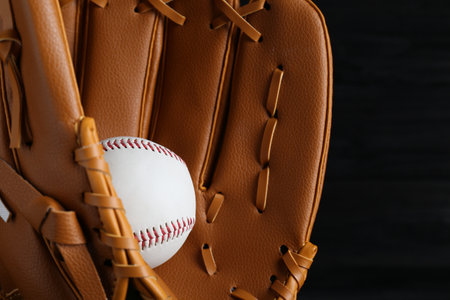 Catcher's mitt and baseball ball on black background, closeup. sports game