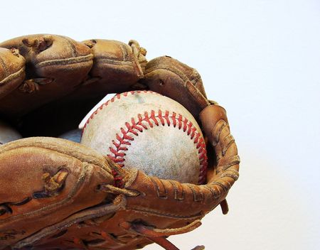 a baseball glove and ball on side position provides copy space for text. background concept isolated white