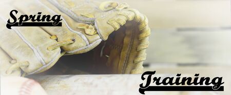 Banner shaped image of old leather baseball mitt, or glove, and bat on wooden background. White vignette and spring training text added
