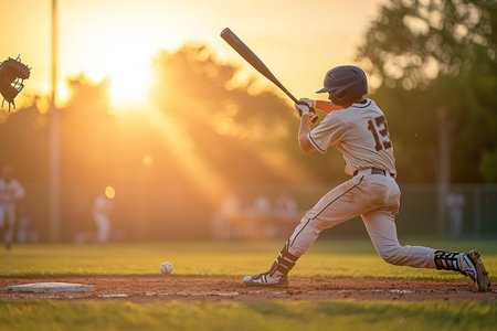 A baseball batter silhouetted against a vibrant sunset swings the bat, with a catcher in the background.