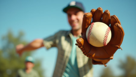 A confident man in a baseball cap holds a ball in a glove, poised to pitch under a bright blue sky. The image captures the thrill of the game, showcasing teamwork and the joy of outdoor sports.