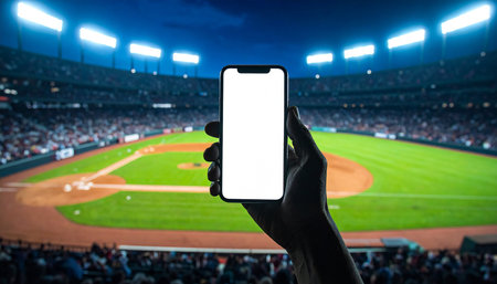 Hand holding a smartphone with white screen on baseball stadium background. Mock up