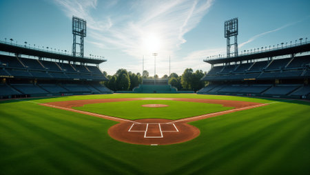 Empty baseball stadium with home plate, dirt infield, green grass and blue seats under clear sky, perfect for sports events, competition, and editorial use, AI generated