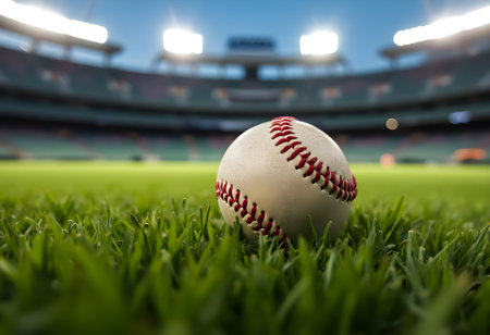 A baseball lies on the green grass inside a stadium, hinting at the excitement of an upcoming game. Bright lights illuminate the field, creating an energizing atmosphere.