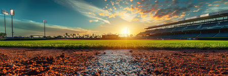 The warm glow of the setting sun casts a golden light over the baseball diamond, highlighting the neatly trimmed grass and the well-defined base lines of the field.