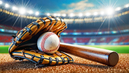 Close-up of a leather baseball glove, baseball ball and wooden baseball bat on a baseball field with blurred stadium illuminated for a night match in the background. Generative Ai.