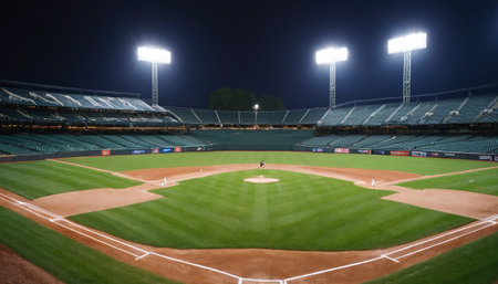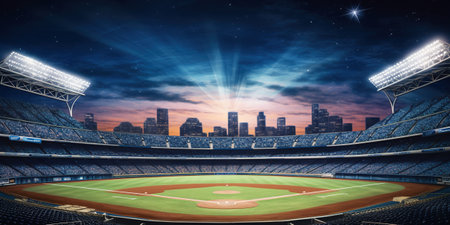 A stunning view of an empty baseball field at night, showcasing bright stadium lights illuminating the lush grass and dirt, with a beautiful city skyline in the background.