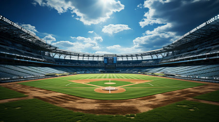 An open baseball stadium is captured from a low angle, emphasizing the field's texture and architecture. The image showcases a bright sky with soft clouds, creating a vibrant outdoor setting. The composition could be useful for commercial and editorial purposes related to sports and events.