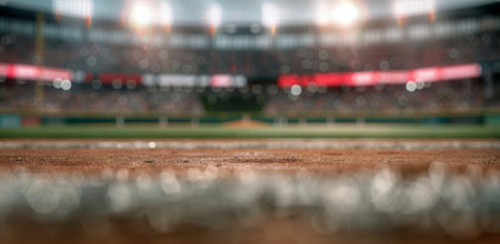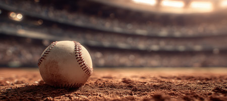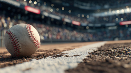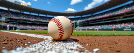 A close-up view presents a baseball on a dirt field with a white line. The composition features soft focus in the background, showing a stadium with spectators. The lighting appears natural, suggesting an outdoor setting. This image may be suitable for promotional materials, articles, or educational content related to sports.