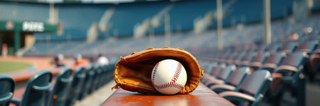 Baseball glove and ball resting on a bench in an empty stadium during an afternoon game