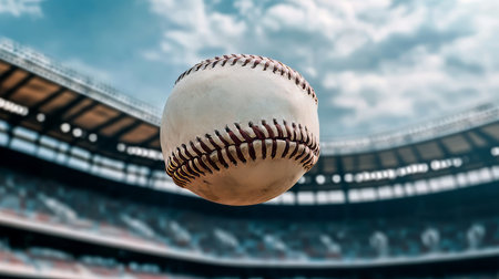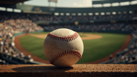 The focal point is a baseball in close-up, positioned at the heart of the stadium, poised for action.