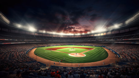 A lively baseball stadium scene showcases a packed crowd and a well-maintained field, surrounded by towering lights and an intense sky, creating an electrifying ambiance