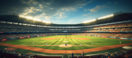 Baseball stadium with green grass field and dramatic sky. 3D Rendering generative ai