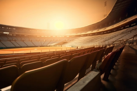 An AI generated illustration of an empty stadium with rows of chairs illuminated by the setting sun