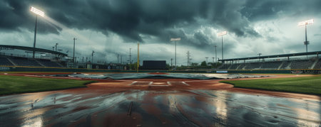 A baseball field with a rain delay, the tarp covering the infield, and dark clouds overhead. The stands are empty, and the wet grass reflects the moody atmosphere.