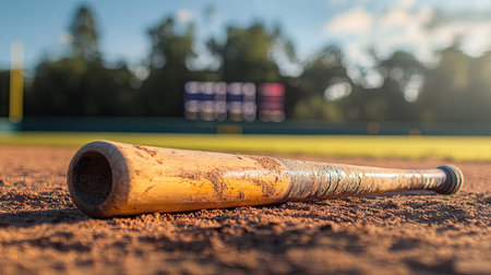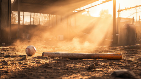 A stunning capture of a baseball bat and ball resting on a dusty field, beautifully illuminated by sunlight. This image evokes the spirit of the game.