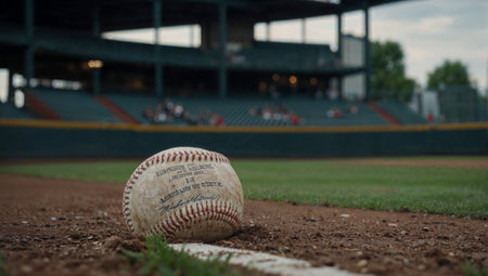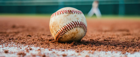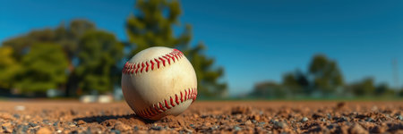A close-up shot of a worn baseball resting on a dirt pitching mound under soft lighting. This image captures the essence of the game and the excitement of outdoor sports.