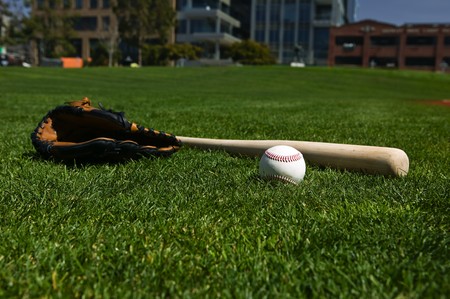 Close-up of baseball glove with ball and bat on green field preparing for baseball game