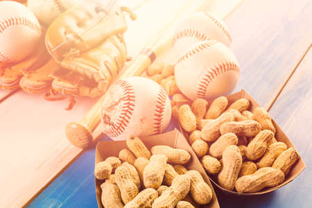 Close up old baseball and wooden baseball bat on a woodeb table. select focus.