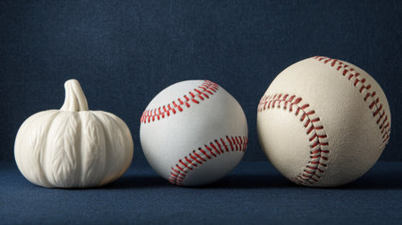 An artistic composition featuring a white pumpkin and two baseballs, perfect for seasonal decor or sports-themed displays, showcasing textures and color contrasts.