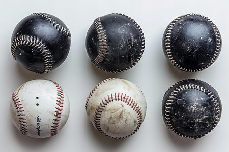 Black and white baseballs on white background, flat lay composition, top view, copy space concept. vintage sports equipment for design elements. minimalistic aesthetic.