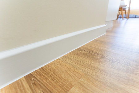 This image shows a closeup of an elegant baseboard against light wooden flooring, highlighting contemporary design in a bright interior, serving as inspiration for home decor enthusiasts