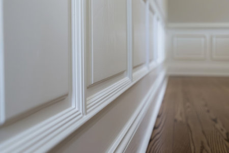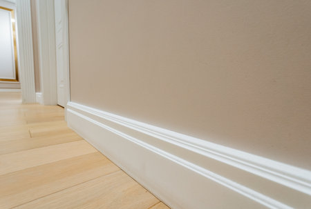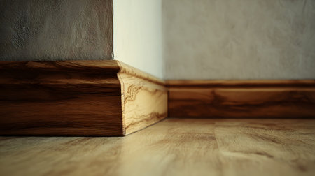 This image shows a closeup of an elegant interior corner, featuring smooth wall paint, polished wooden flooring, and crafted baseboard trim, exemplifying refined design and luxurious living