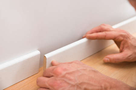 Worker's hands Instal plastic skirting board on laminate flooring. Renovation of baseboard at home.