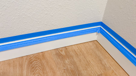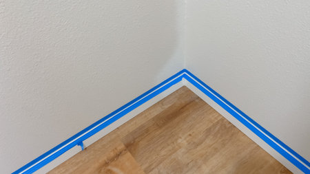 Interior closet corner with white baseboards carefully masked using painter tape. The wood floor and light walls create a bright, clean setting for home improvement work.
