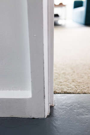 close up of tile flooring and architrave with old worn out materials in need to be fixed, concept of diy and home improvements