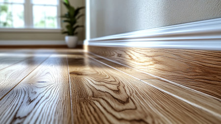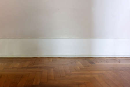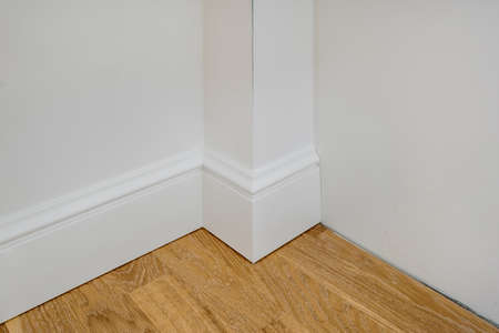 This image shows a close up of a beautiful wooden floor complemented by a pristine white skirting board, showcasing the elegant combination of materials used in interior design and decoration