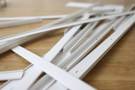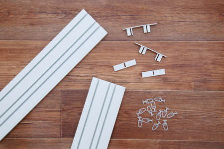 White plastic ceiling curtain rod with assembly hardware and hooks. On a brown wooden background.