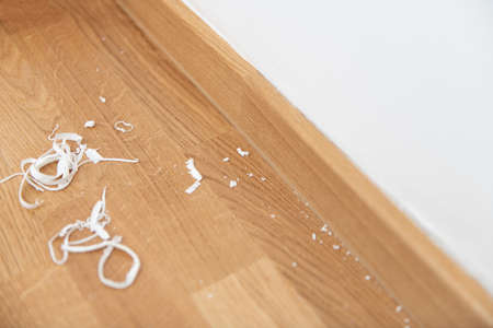Construction Worker Remove Old Siliicone and Applying New One for Repairing and Installing Parquet in House