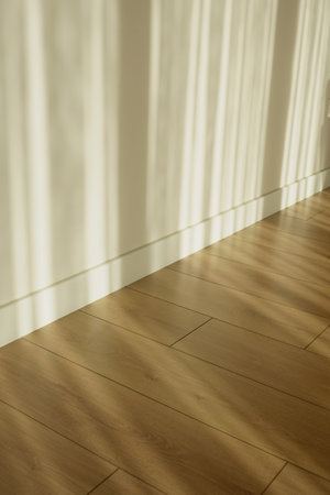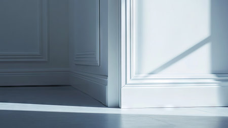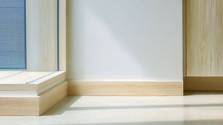 Soft sunlight illuminates a clean corner of a contemporary interior featuring wooden trim and a smooth floor. The design emphasizes simplicity and elegance.