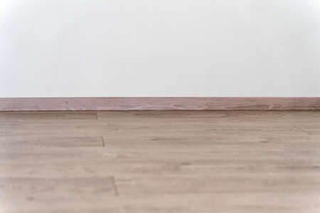 Interior concept. Light matte wall, white baseboard and tiles immitating hardwood flooring
