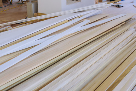 Installed to base moldings of a new house under construction using nail gun carpenter
