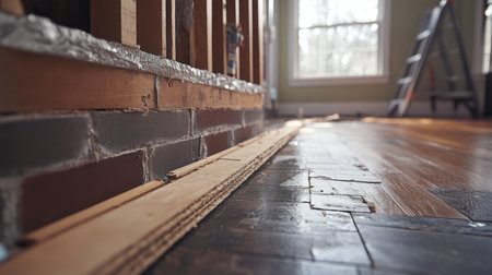 A detailed view of a room undergoing renovation, showcasing an exposed wall, wooden flooring, and natural sunlight illuminating the space during the construction process.