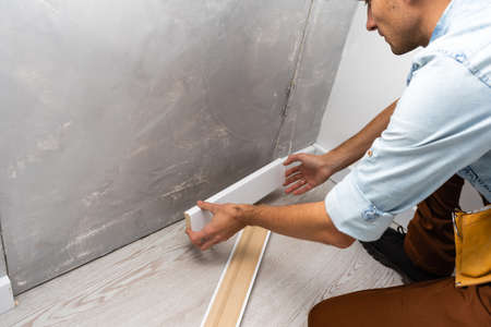 Man hands intall floor plastic skirting boards. replacement of the plastic skirting board on the floor.