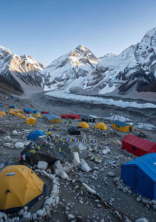 Group of climbers ' bright color tents on the Khumbu glacier in area of Everest base camp with colorful prayer flags and himalaya mountain range in background during a clear blue sky day