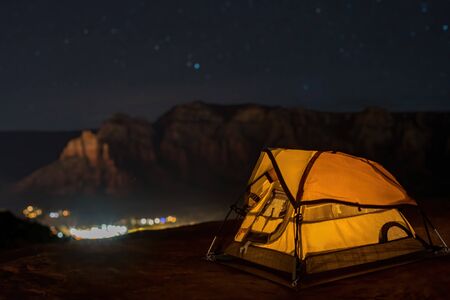 Orange yellow and green gloving tent at camping in the mountain gorge under night sky with stars