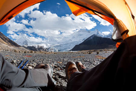View from tent on snow-capped mountains. Trips and expeditions in the wild. The concept of camping
