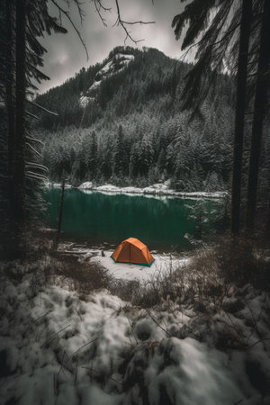 Camp Setup in Icy Terrain Showcases Vibrant Tents and Snowmobiles Against a Winter Backdrop in a Remote Location. Generative AI