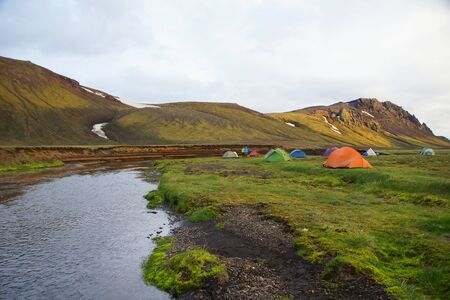 Beautiful landscape by the mountain lake Alftavatn, a cool summer evening and tourist camping