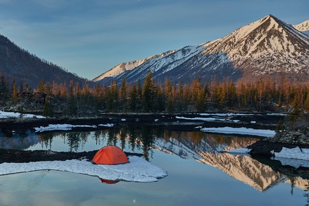 camping place. Tent in the frosty morning with Belukha Mountain view from the Akkem lake. mountain valley. Altai Mountains