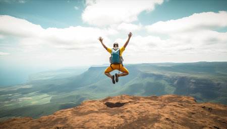 An AI generated illustration of A man in activewear performing a daring leap off a cliff overlooking a scenic canyon