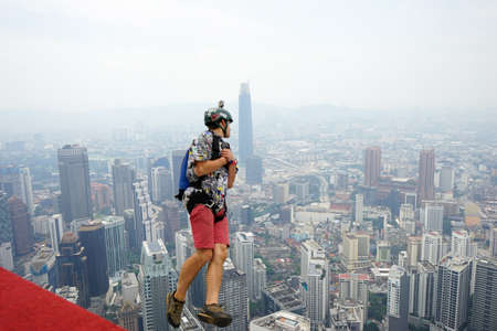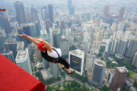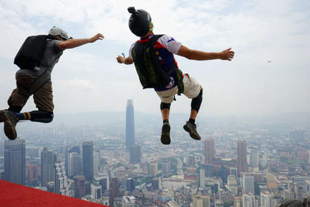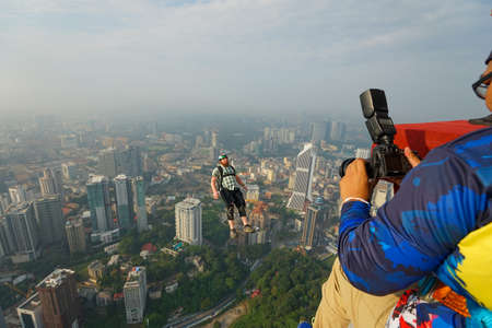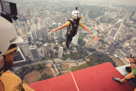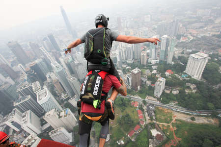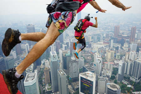 Kuala Lumpur, Malaysia – September 28, 2018: Base Jumpers jump from a 300m high deck during the Kuala Lumpur Tower International Jump.